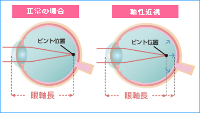 子どもの近視は、主に眼球が楕円形に伸びてしまう(眼軸長が伸びる)ことで、ピント位置がずれることにより生じるケースが多くあります。