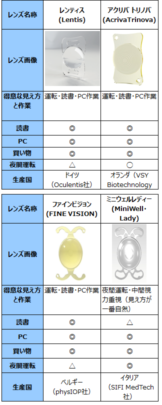 多焦点眼内レンズは、焦点を1つの距離のみに合わせる単焦点眼内レンズと異なり、遠距離、中間距離、近距離など複数にピントが合います。手元から遠くまでおおよそピントが合います。多焦点眼内レンズには、いくつか種類があり、この中間距離にピントをもつレンズ(パソコンくらいに焦点が合いやすいレンズ)、近くと中間と遠くの3焦点にピントを持つレンズ(ほぼすべての距離に焦点が合うレンズ)など、海外で実際に使用されている先進的な眼内レンズを取り寄せて手術に使用することも行っております。
